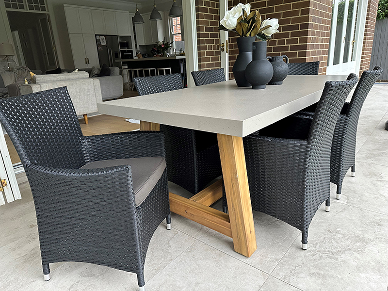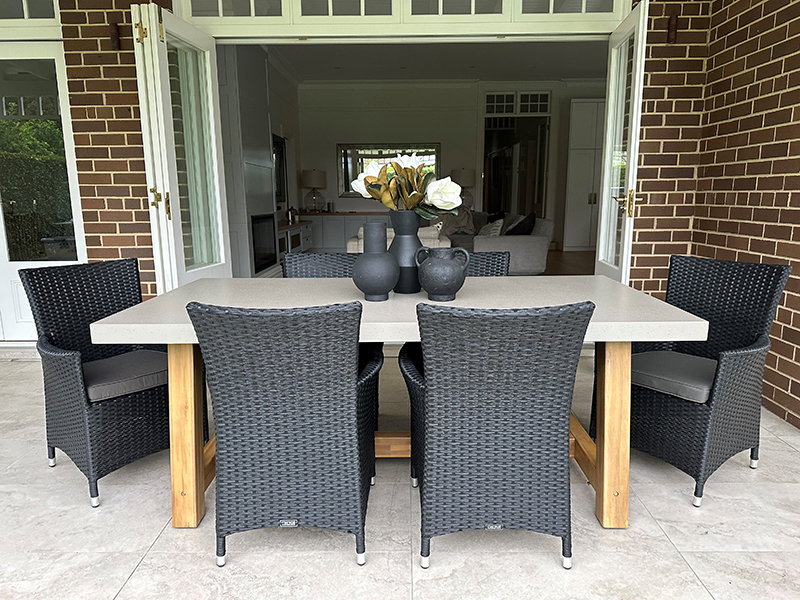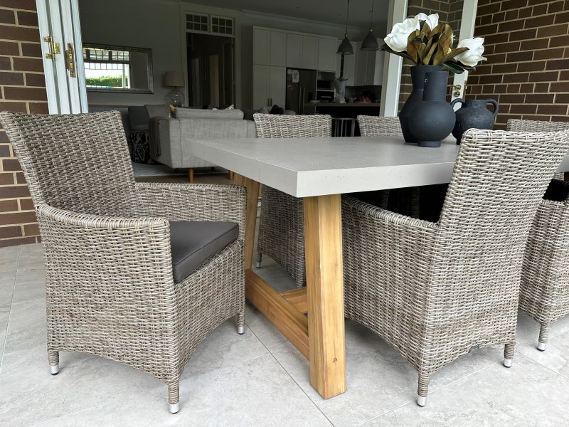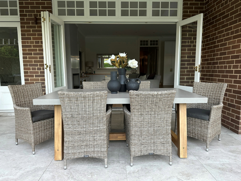Modern meets industrial incorporating acacia timber frame design with an ash grey concrete table top and Gartemobe wicker dining chairs. This Modern Industrial Outdoor Dining Setting will compliment your outdoor living sanctuary.