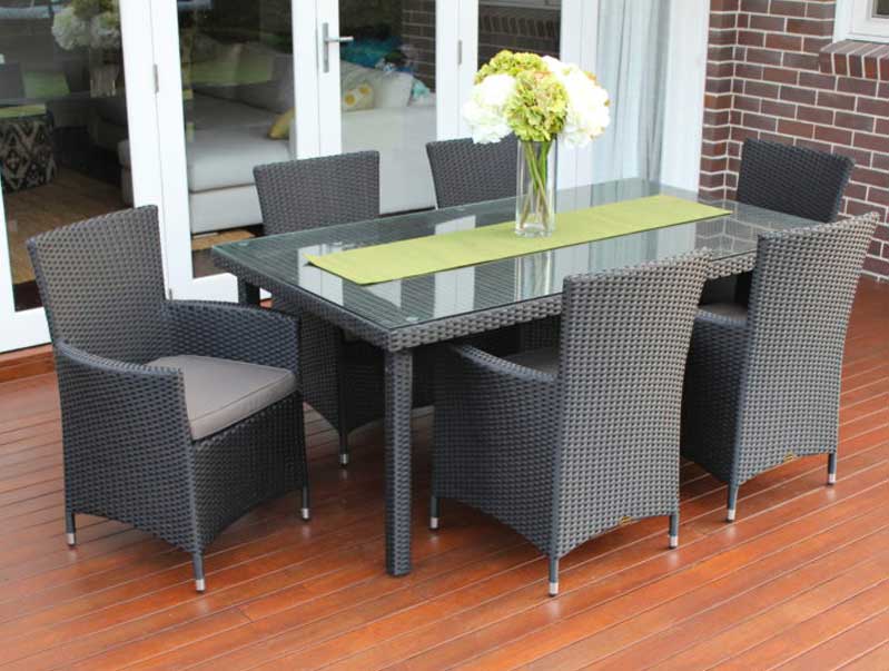 This setting is comfortable and spacious featuring a 160cm dining table and six matching dining chairs. All 7 pieces have been manufactured using high quality UV stabilised rattan covered over a heavy-duty powder coated aluminium frame. The table has been topped with a piece of clear, tempered glass, whilst each of the chairs come complete with a plush 6cm thick seat cushion, available in a variety of colours. Weather covers for the Gartemoebe 7-piece dining set are a custom fit and go over the chairs and table.