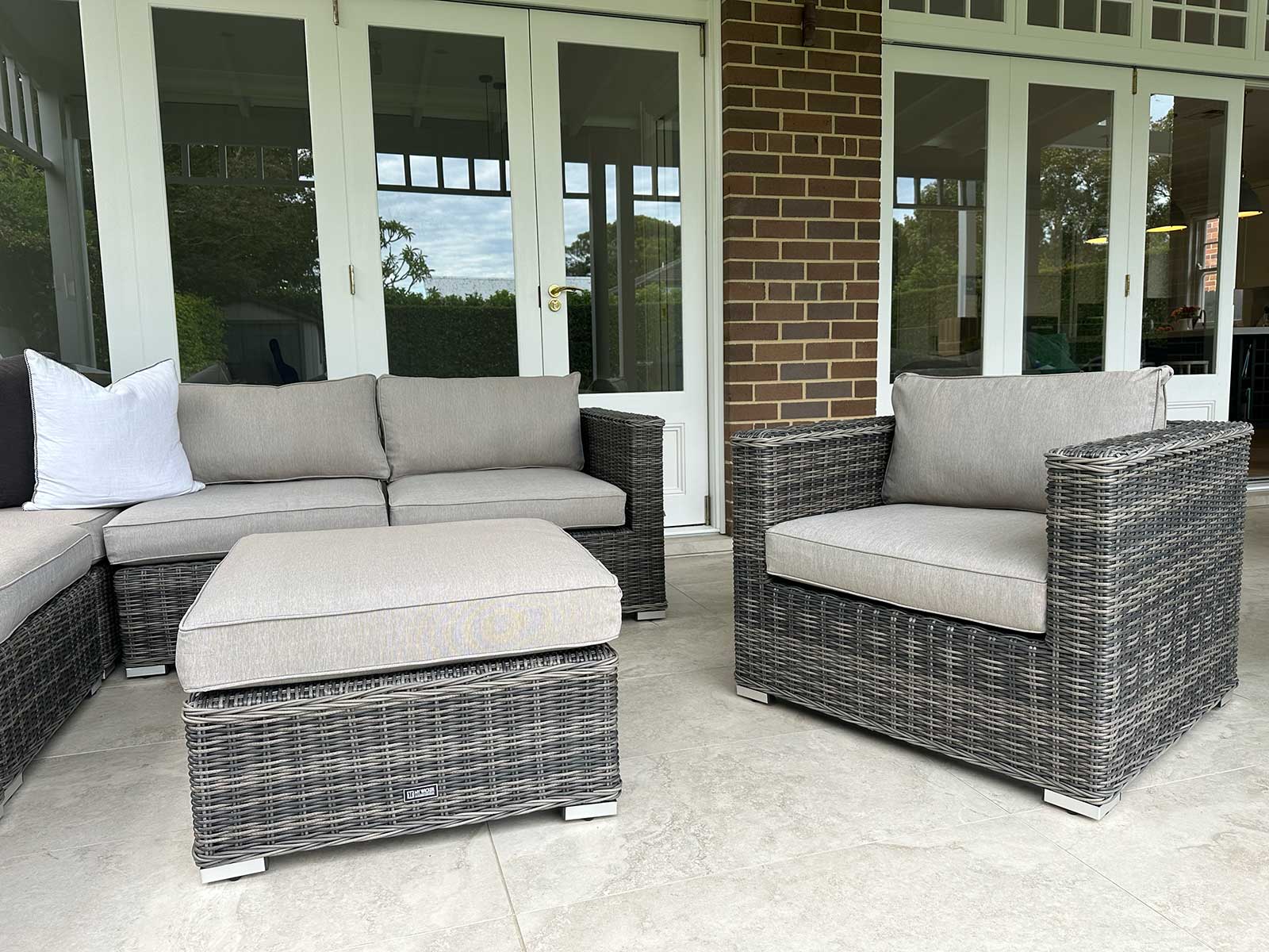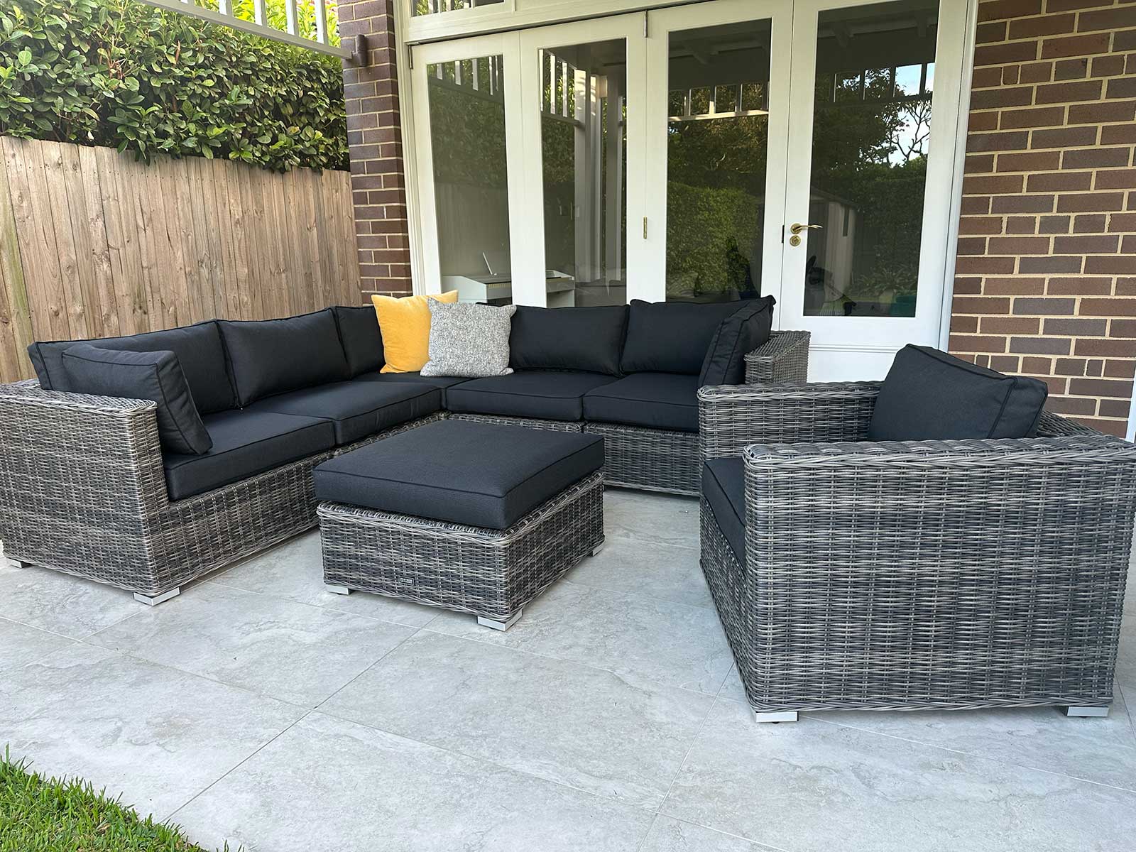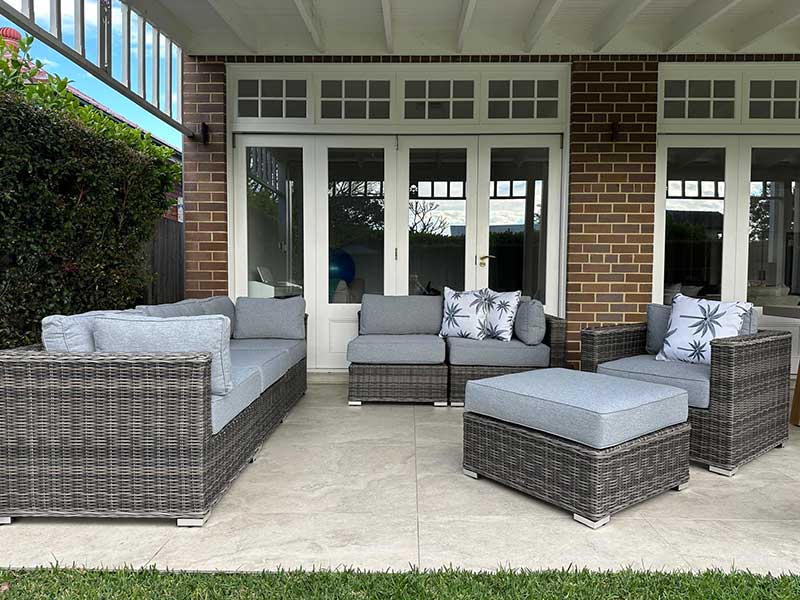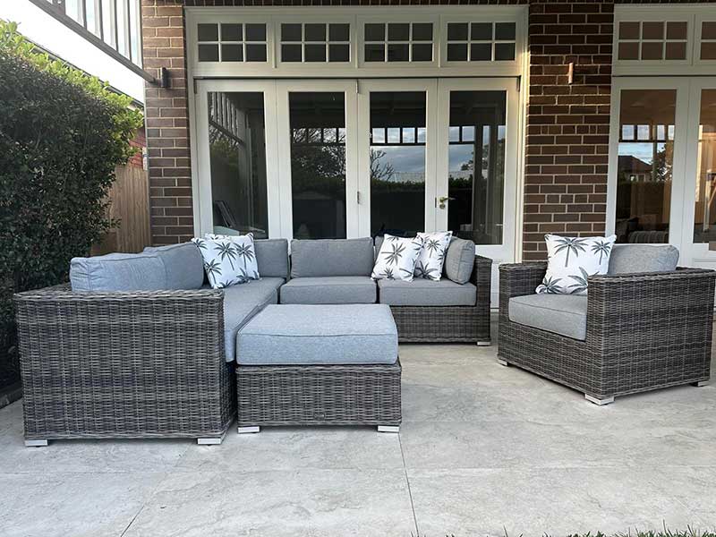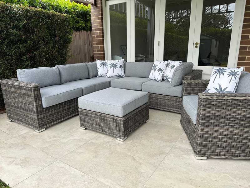 This Grand Wicker lounge set oozes European styling, quality craftmanship and superior comfort. We were able to achieve this by oversized custom design, meticulously handcrafted on a powder coated aluminum framework , fitted with extra thick cushioning and adorned with latest in trend European inspired fabrics.