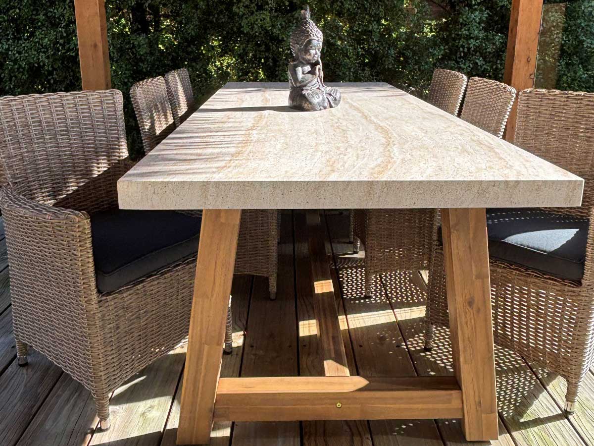 Modern meets industrial incorporating acacia timber frame design with a travertine look table top. This Modern Industrial Outdoor Dining Setting will compliment many outdoor living styles. The Veltis table has been built using polystone to create a beautiful travertine look.